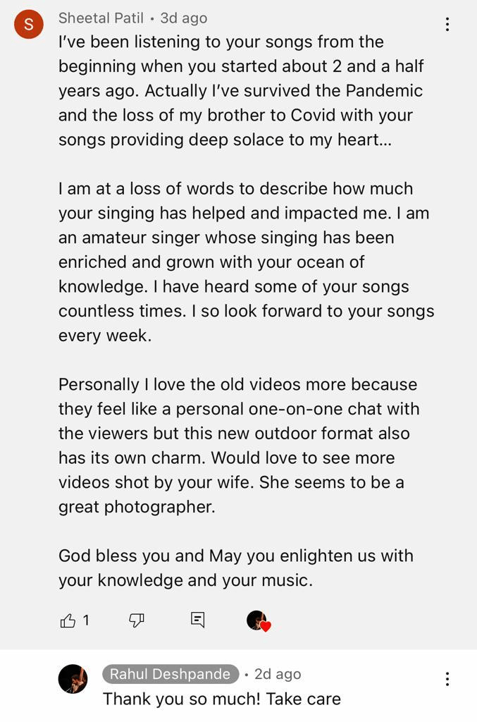 As an addition to the above article, I am happy to post a reply I received from The Great Rahul Deshpande to my message to him a few months back. I cannot express the happiness I experienced, receiving a short but a compassionate reply from him. Posting a screenshot of the message below: